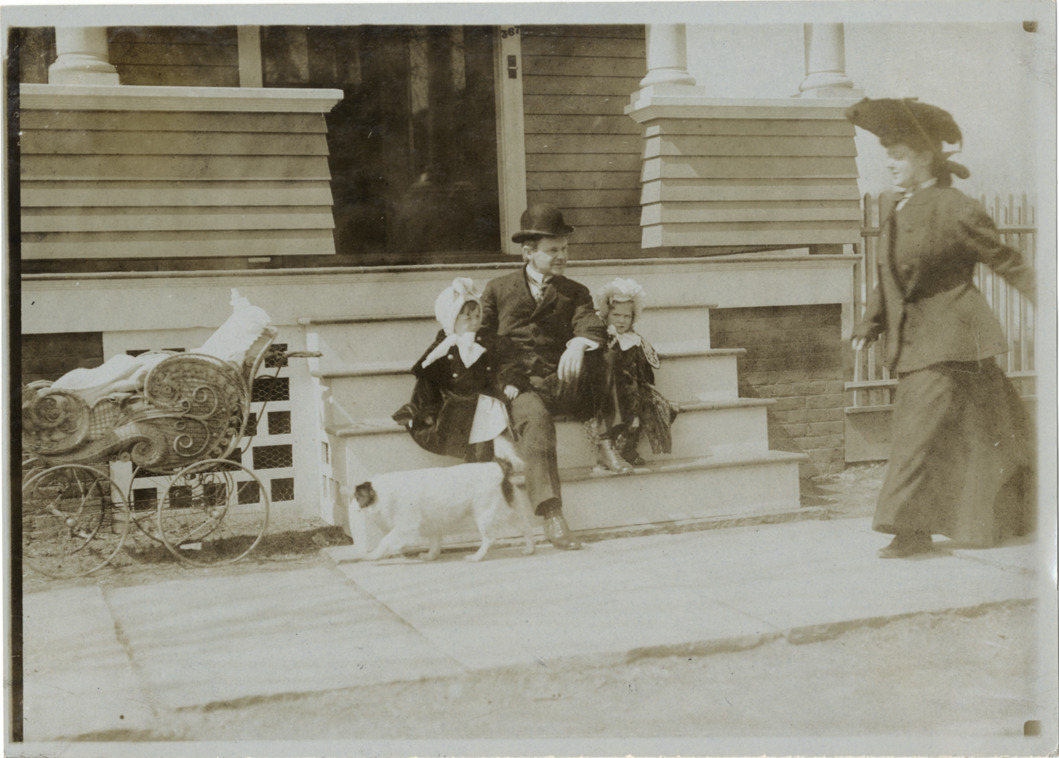 Favorite this☆ Man sitting on steps with two girls Description: View of a man sitting on porch steps with two girls; baby carriage and dog in front of porch. Woman walks on sidewalk. Handwritten on back: "Biography--Unidentified." Details Resource ID: na004291 Subject: Men Girls Baby carriages Photographic prints Date Issued: Unknown year Format: 1 photographic print ; 5.25 x 7 in. Member of: National Automotive History Collection Lazarnick Collection Filing Location: Biography--Unidentified #2 Rights: Physical rights are retained by DPL. Copyright is retained in accordance with U.S. copyright laws.