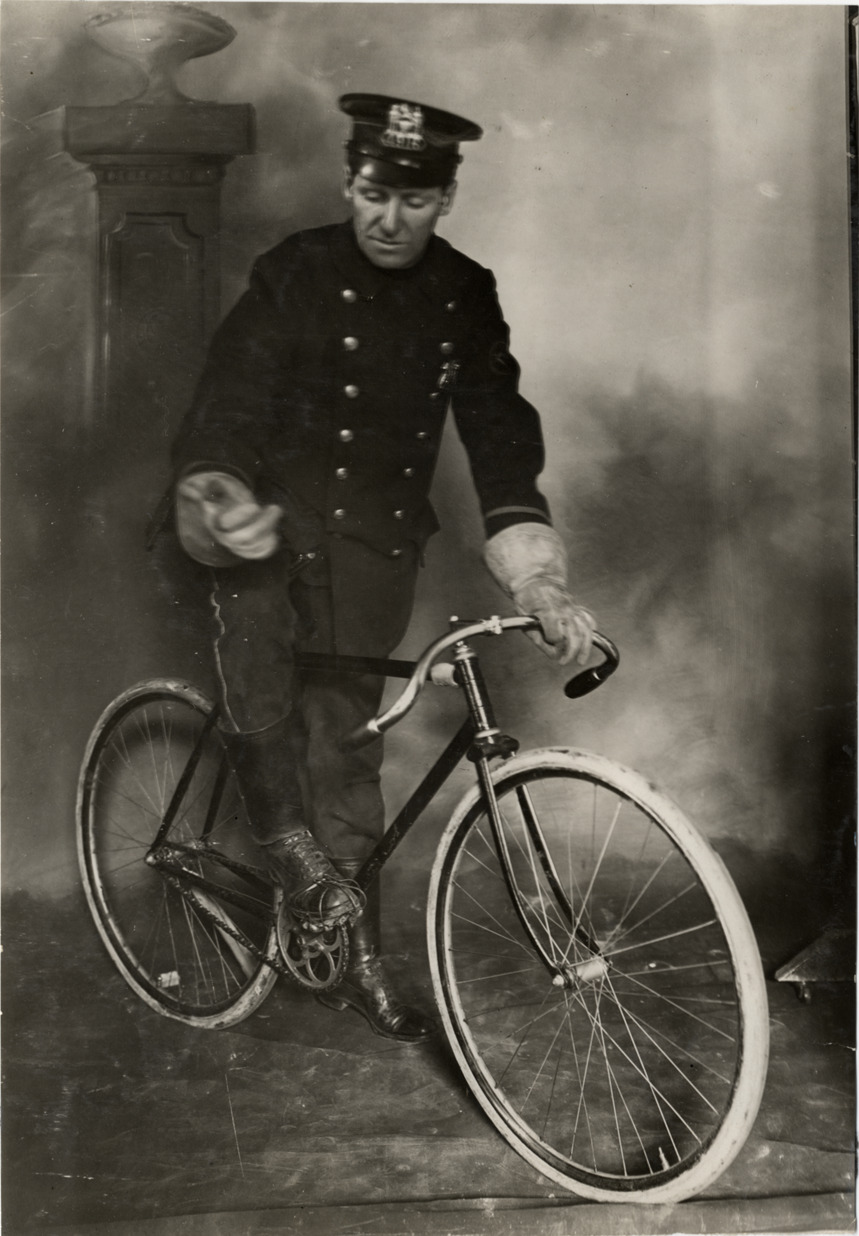 Favorite this☆ Policeman and bicycle Description: Portrait of a police officer posing in front of painted backdrop with bicycle. Handwritten on back: "Biography--No I.D., taken in 1908." Details Resource ID: na004346 Subject: Police Bicycles Bicycle police Photographic prints Date Issued: 1908 Format: 1 photographic print ; 8.25 x 5.75 in. Member of: National Automotive History Collection Lazarnick Collection Filing Location: Biography--Unidentified #4 Rights: Physical rights are retained by DPL. Copyright is retained in accordance with U.S. copyright laws.
