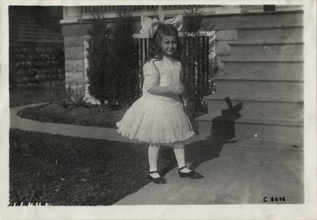 Portrait of girl standing in front of house; girl wears ruffled dress and large ribbon in her hair. Stamped on back: "Spooner & Wells, Inc., photographers, telephones 3472-3473 Columbus, 1931 Broadway, New York." Handwritten on back: "Biography--Unidentified, 1910."