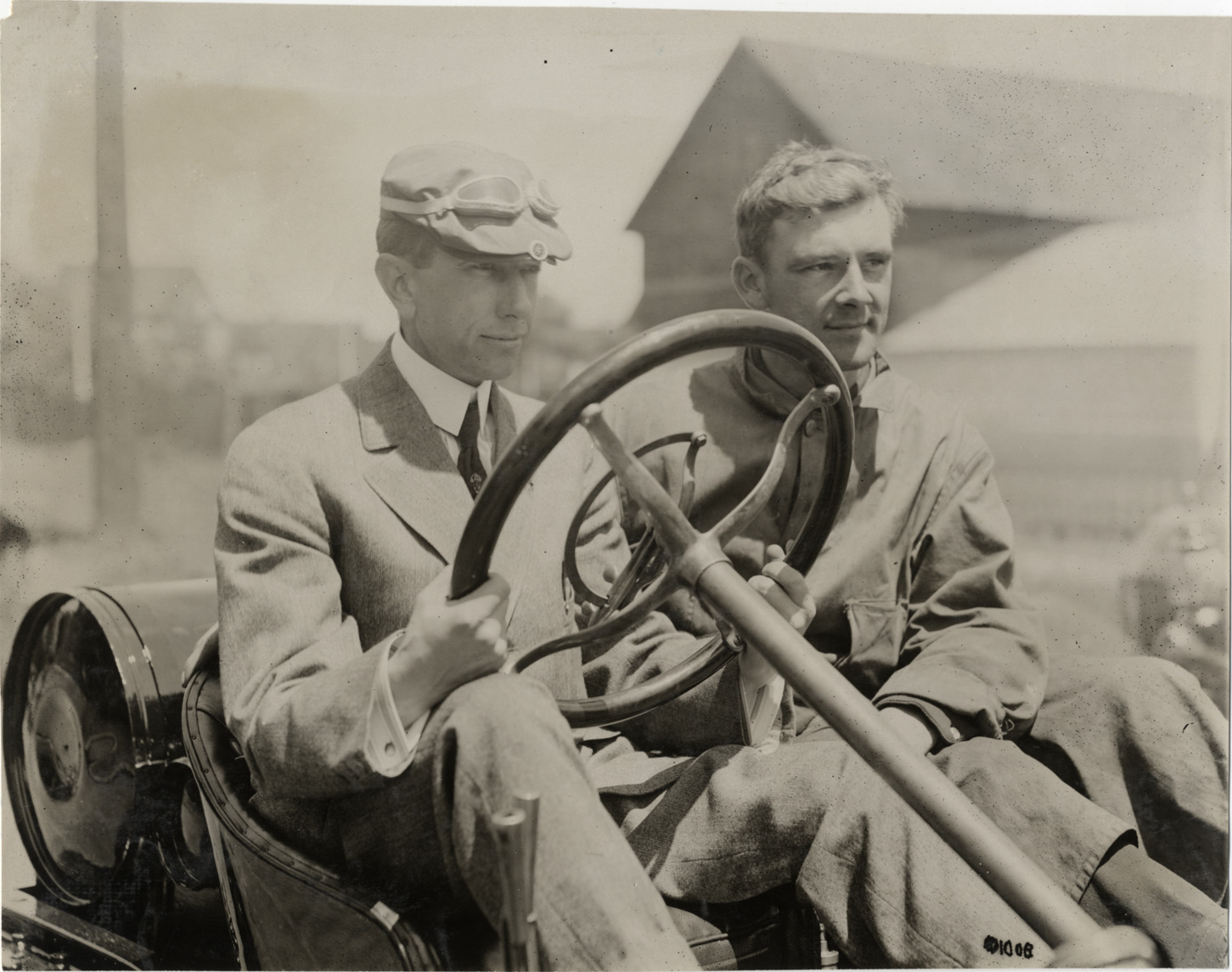 View of two men in Hudson racecar. Stamped on back: "Spooner & Wells, Inc., photographers, telephone North 1745. 1231 Woodward Ave., Detroit, Mich. Detroit, 1231 Woodward, New York, 1931 Broadway." Handwritten on back: "Biography--Unidentified, 1910. Hudson."