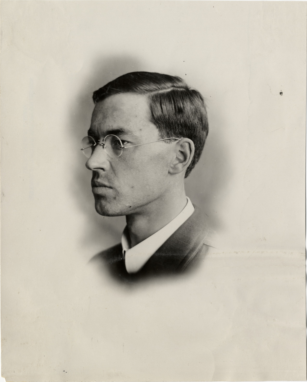 Portrait of a man wearing eyeglasses. Stamped on back: "Spooner & Wells, Inc., photographers, telephone North 1745. 1231 Woodward Ave., Detroit, Mich. Detroit, 1231 Woodward, New York, 1931 Broadway." Handwritten on back: "Biography--Unidentified, 1910."