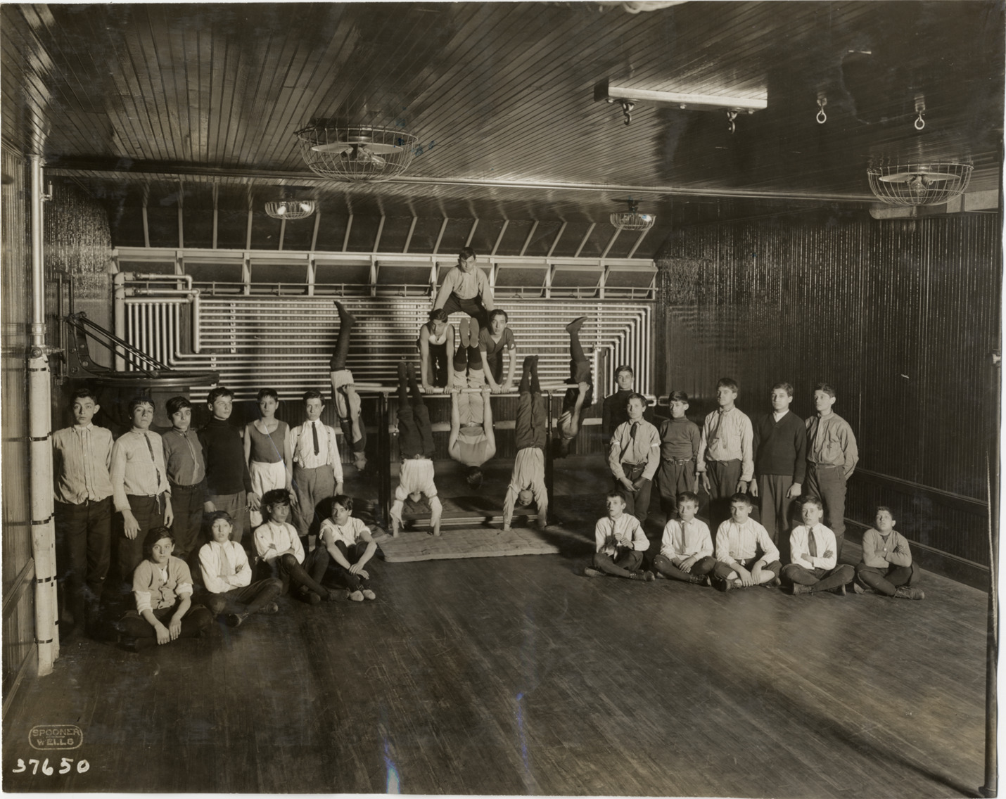 View of group of teenage boys posing in gymnasium; several young men pose on parallel bars. Printed on front: "Spooner, Wells." Stamped on back: "Spooner & Wells, Inc., photographers, telephones 3472-3473 Columbus, 1931 Broadway, New York." Handwritten on back: "Biography--Unidentified, 1910."