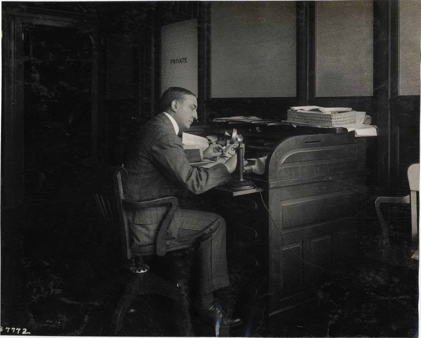 Favorite this☆ Man working at desk Description: Portrait of man working at desk; telephone on corner of desk. Stamped on back: "Spooner & Wells, Inc., photographers, telephones 3472-3473 Columbus, 1931 Broadway, New York." Handwritten on back: "Biography--Unidentified, 1910." Details Resource ID: na004571 Creator: Spooner & Wells Subject: Men--Portraits Desks Telephone Photographers--New York (State)--New York Photographic prints Date Issued: 1910 Format: 1 photographic print ; 7.5 x 9.5 in. Member of: National Automotive History Collection Lazarnick Collection Filing Location: Biography--Unidentified #12 Rights: Physical rights are retained by DPL. Copyright is retained in accordance with U.S. copyright laws.