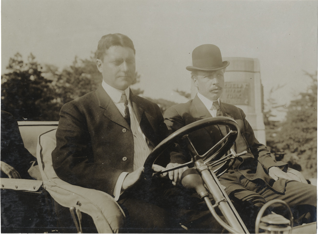 View of two men in car. Stamped on back: "Photo by Spooner and Wells, 1536 Broadway, New York. Duplicates any time, any quantities, enlargements any size this plate." Handwritten on back: "Biography--Unidentified, 1906."