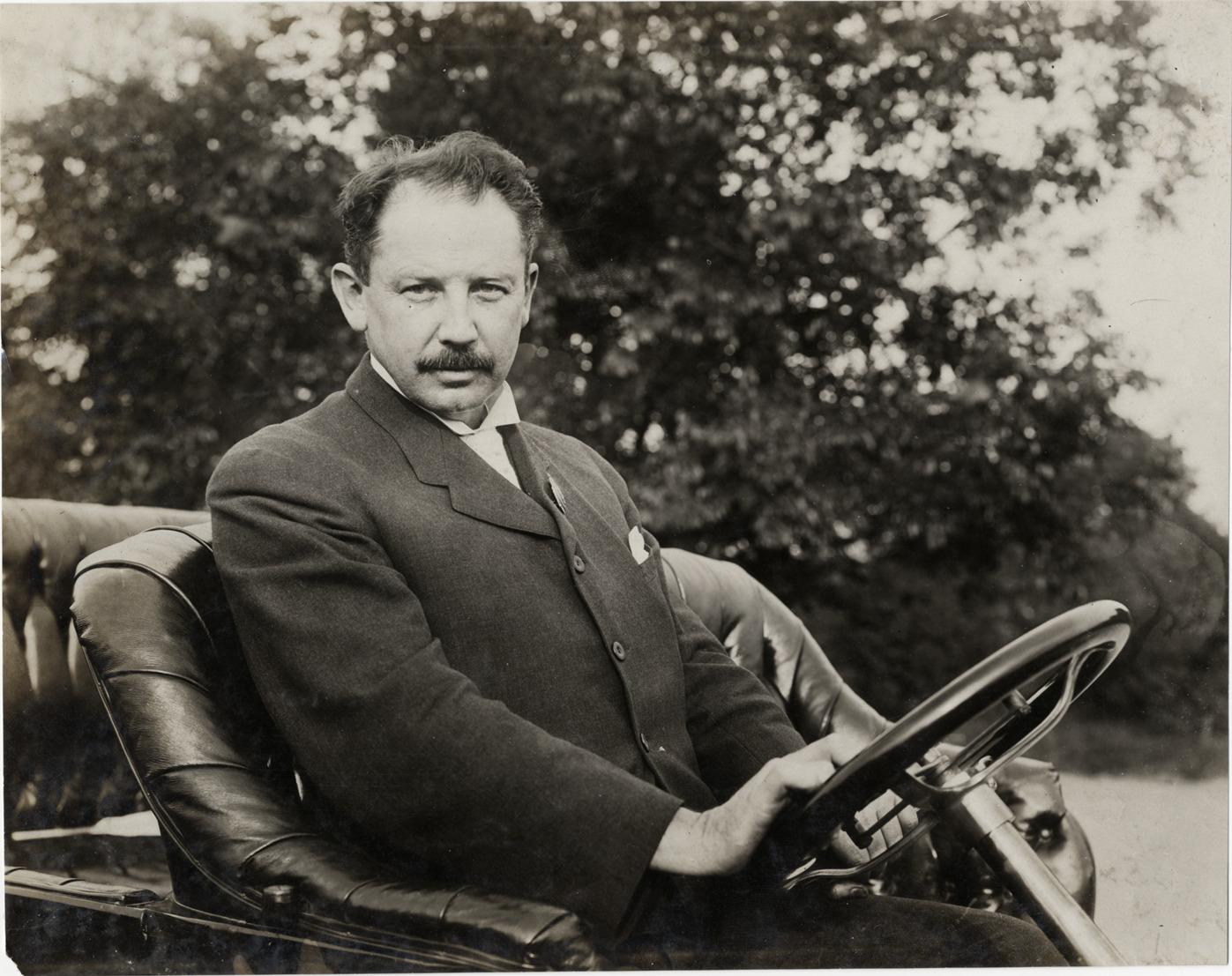 Portrait of man in car. Stamped on back: "F. Ed. Spooner, and Chas. S. Wells. Motor News, Motor Photos, Motor Adv, 1536 B'way, New York. Tel 6536-38th St." Handwritten on back: "Biography--Unidentified, 1906."