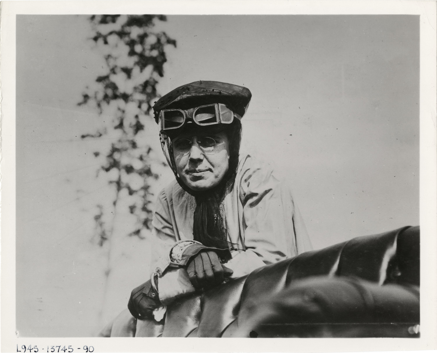 View of woman wearing driving clothes, leaning over seat of automobile. Handwritten on back: "Biography--Unidentified."