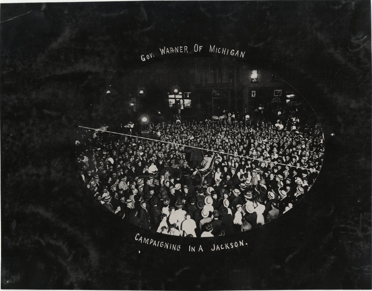 View of Governor Fred M. Warner speaking to large crowd while standing in a Jackson car in Jackson, Michigan. Printed on front: "Gov. Warner of Michigan campaigning in Jackson." Stamped on back: "Spooner & Wells, Inc., photographers, telephones 3472-3473 Columbus, 1931 Broadway, New York." Handwritten on back: "Biography--Warner, Fred M. Michigan governor, 1908, campaigning in Jackson Motor car.