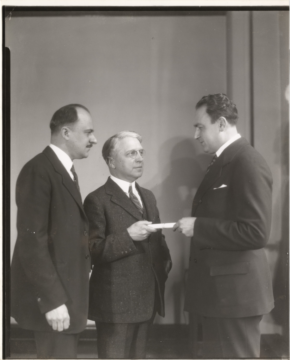 View of John N. Willys, George Bauer and unidentified man. Stamped on back: "Photographic illustration by Nick Lazarnick, 230 Park Ave., N.Y." Handwritten on back: "Biography--Willys, John N. N.A.C.C., Geo. Bauer, export mgr. (left), John N. Willys, chairman."