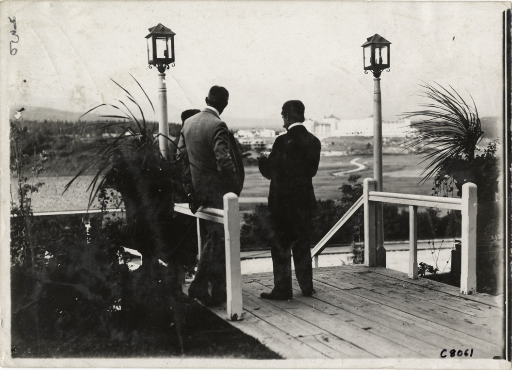 View of Alexander Winton and two unidentified men at Climb to the Clouds event in Bretton Woods, New Hampshire. Handwritten on back: "Biography--Alexander Winton. Event, Climb to the Clouds hill climb, 1904, Bretton Woods, N.H. Winton has black suit on. Mr. Winton takes a look."