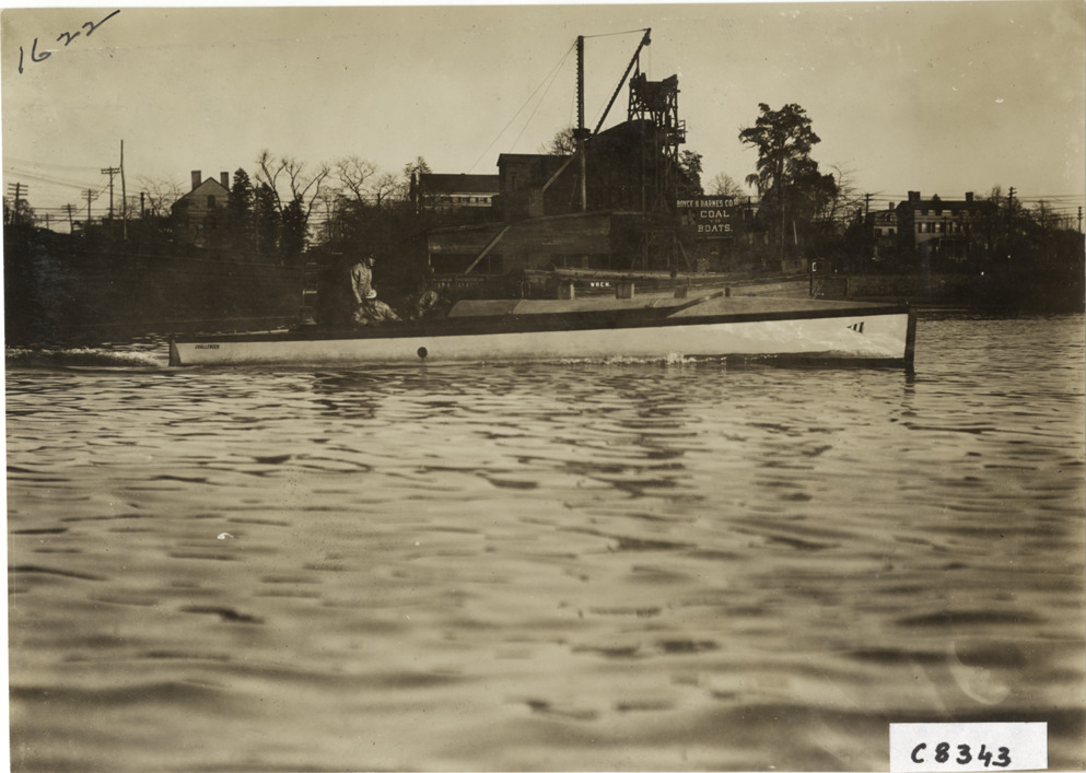 View of the motorboat "Challenger". Boyce & Barnes Co. coal boats sign on shore. Handwritten on back: "Boats and boating, 1904. Boat: Challenger. Engine: Simplex. Designer: Clinton Crane. LOA: -40'. Not very successful follow-up to Vingt et Un II. Built as Harnsworth Challenger."