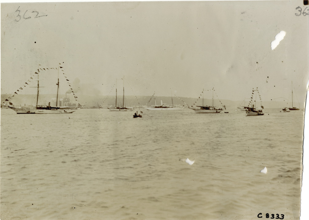 View of several boats decorated with regatta flags. Handwritten on back: "Boats and boating, 1904."