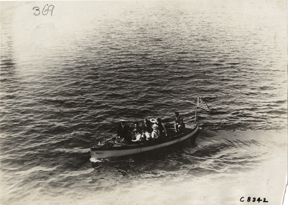 Favorite this☆ Men on motorboat "Peggy" Description: View of group of men on motorboat "Peggy"; anchor and flag on boat. Handwritten on back: "Boats and boating, 1904. [undechiperable] launch with committee." Details Resource ID: na004724 Subject: Motorboats Launches Photographic prints Date Issued: 1904 Format: 1 photographic print ; 4.75 x 6.75 in. Member of: National Automotive History Collection Lazarnick Collection Filing Location: Boats and boating, 1904 #1 Negative Number: Negative #C8342 Rights: Physical rights are retained by DPL. Copyright is retained in accordance with U.S. copyright laws.