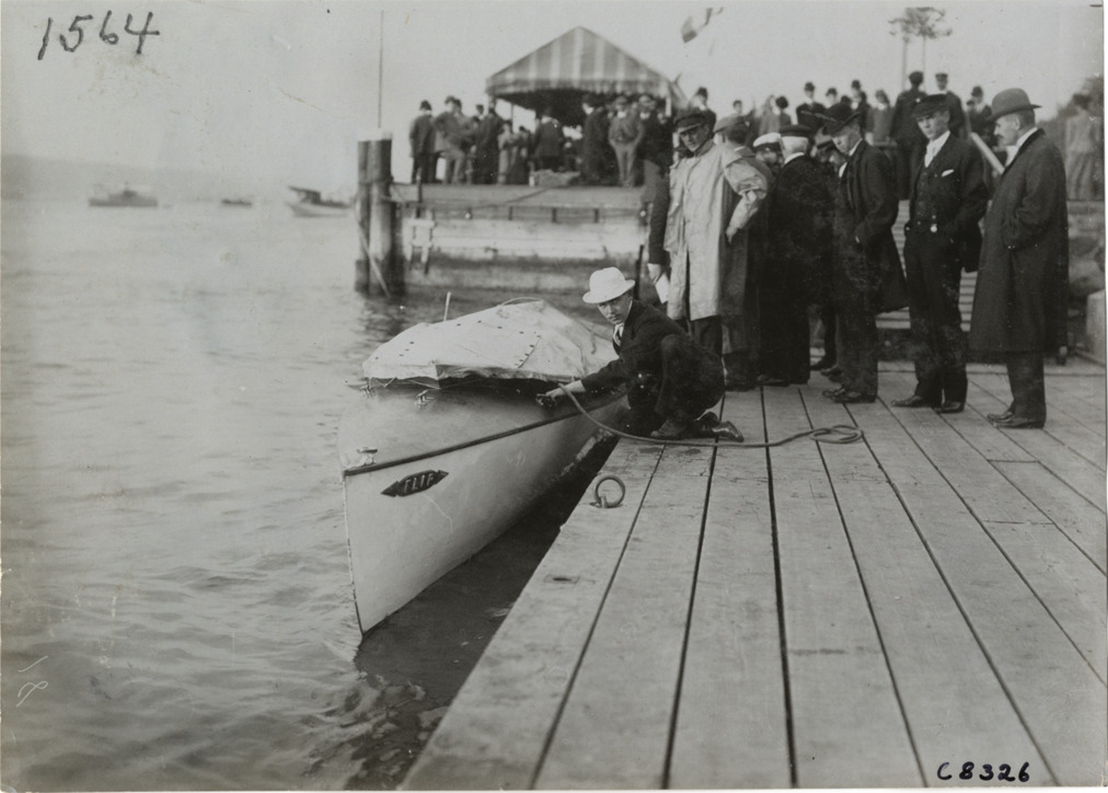 Favorite this☆ Motorboat "Flip" Description: View of man kneeling on dock next to motorboat "Flip"; group of men stand on dock. Tent and spectators in background. Handwritten on back: "Boats and boating, 1904. Flip & [undecipherable] docked." Details Resource ID: na004730 Subject: Motorboats Docks Photographic prints Date Issued: 1904 Format: 1 photographic print ; 5 x 7 in. Member of: National Automotive History Collection Lazarnick Collection Filing Location: Boats and boating, 1904 #2 Negative Number: Negative #C8326 Rights: Physical rights are retained by DPL. Copyright is retained in accordance with U.S. copyright laws.