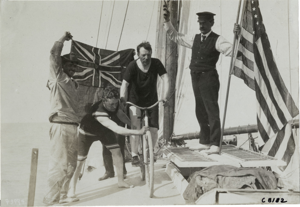 View of William J. "Senator" Morgan on bicycle on board sailboat; one man holds starter pistol and American flag; other man holds British flag. Scene is parody of 'Flag to Flag' race at Palm Beach boat carnival. Stamped on back: "Photo by N. Lazarnick, 29 West 42nd Street, New York." Handwritten on back: "Boats and boating--Palm Beach water boat carnival, 1905. A burlesque on the 'Flag to Flag' race showing Senator Morgan on a bicycle & Commodore Allen with gun starting him off."