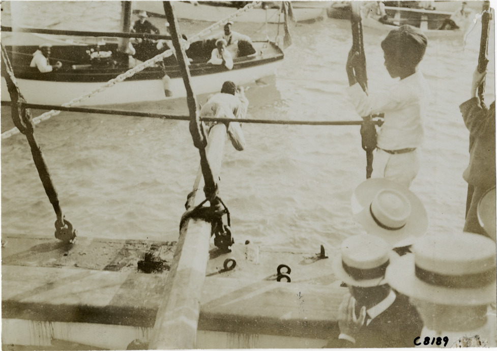 View of a teenage boy climbing on pole of ship over water at Palm Beach boat carnival; group of men watches from boat in background. Stamped on back: "Photo by N. Lazarnick, 29 West 42nd Street, New York." Handwritten on back: "Boats and boating--Palm Beach water boat carnival, 1905."