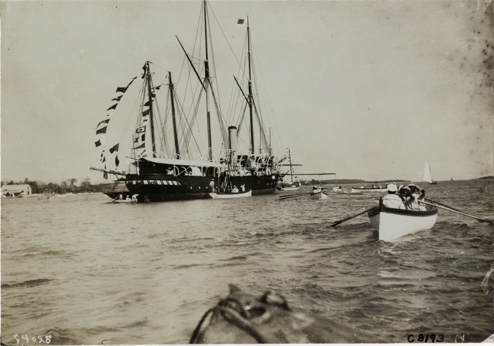 View of sailing ship and rowboats at Palm Beach boat carnival. Stamped on back: "Photo by N. Lazarnick, 29 West 42nd Street, New York." Handwritten on back: "Boats and boating--Palm Beach water boat carnival, 1905."