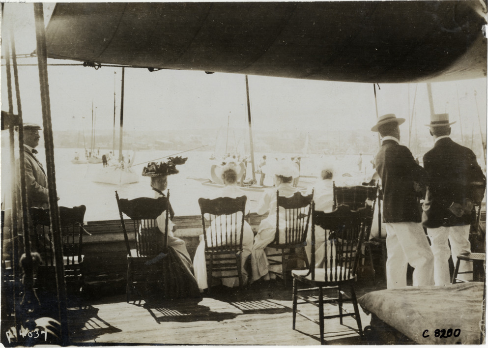 View of men and women, some sitting on high-back chairs, watching regatta under awning at Palm Beach boat carnival. Stamped on back: "Photo by N. Lazarnick, 29 West 42nd Street, New York." Handwritten on back: "Boats and boating--Palm Beach water boat carnival, 1905. Viewing the regatta."