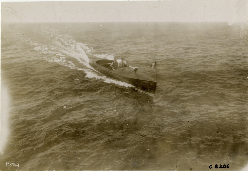 View of two men on motorboat at Palm Beach boat carnival. Handwritten on back: "Boats and boating--Palm Beach water boat carnival, 1905."