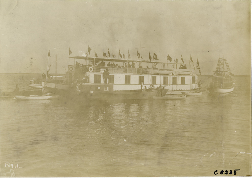 Favorite this☆ Ferry and tugboat at Palm Beach boat carnival Description: View of ferry and tugboat decorated with flags at Palm Beach boat carnival. Handwritten on back: "Boats and boating--Palm Beach water boat carnival, 1905." Details Resource ID: na004796 Subject: Ferries--Florida--Palm Beach Tugboats--Florida--Palm Beach Photographic prints Date Issued: 1905 Format: 1 photographic print ; 4.75 x 6.75 in. Member of: National Automotive History Collection Lazarnick Collection Filing Location: Boats and boating--Palm Beach water boat carnival, 1905 #3 Negative Number: Negative #C8235 Rights: Physical rights are retained by DPL. Copyright is retained in accordance with U.S. copyright laws.