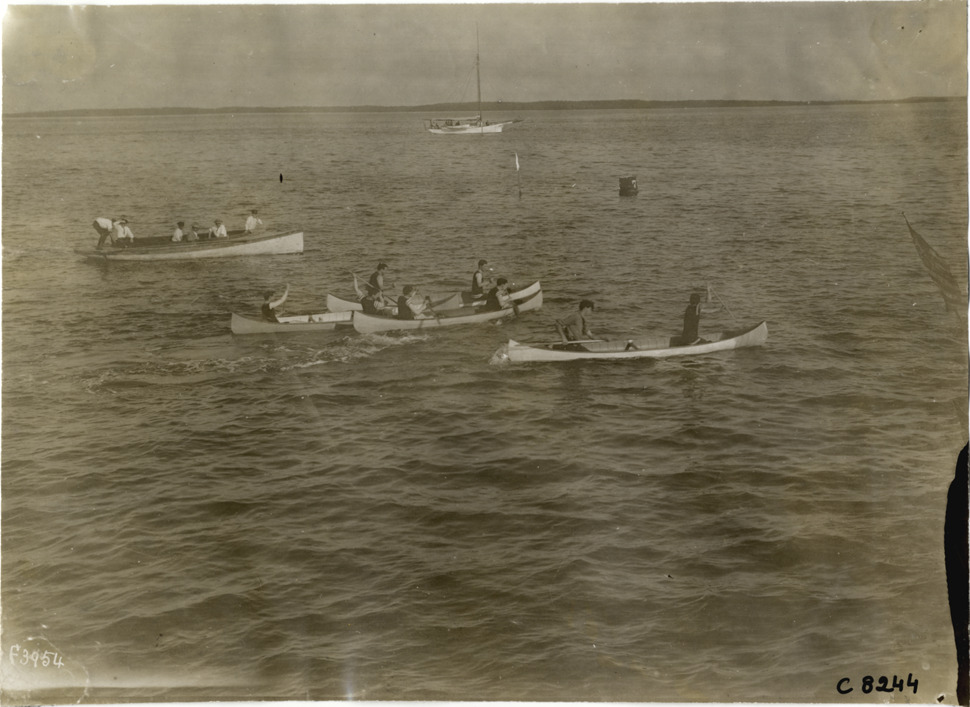 View of men rowing canoes at Palm Beach boat carnival; motorboat in background. Handwritten on back: "Boats and boating--Palm Beach water boat carnival, 1905."
