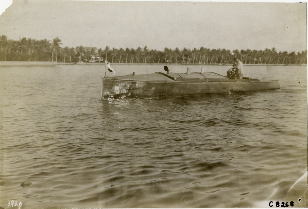 View of two men in motorboat at Palm Beach boat carnival. Handwritten on back: "Boats and boating--Palm Beach water boat carnival, 1905."