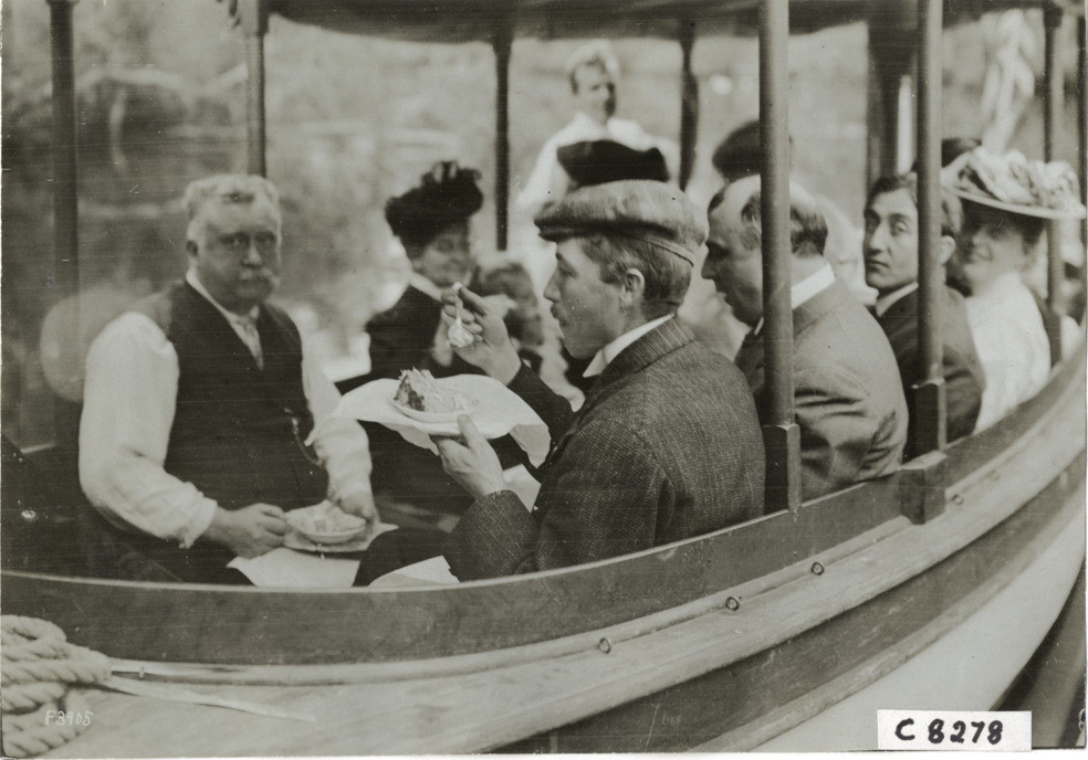 View of boating party on boat at Palm Beach boat carnival; man in foreground eats piece of cake. Stamped on back: "Photo by N. Lazarnick, 29 West 42nd Street, New York." Handwritten on back: "Boats and boating--Palm Beach water boat carnival, 1905. Party that went from Ormond to Palm Beach."