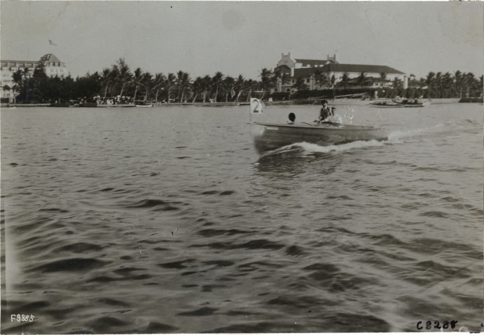 View of two men on motorboat at Palm Beach boat carnival; flag with number "2" on boat. Stamped on back: "Photo by N. Lazarnick, 29 West 42nd Street, New York." Handwritten on back: "Boats and boating--Palm Beach water boat carnival, 1905. [undecipherable], J.R. Duso, New Smyrna, Fla."