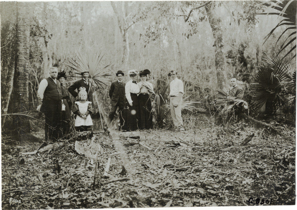 View of group of men, women and a girl posing in wooded area near Hotel Palm Beach during Palm Beach boat carnival. Stamped on back: "Photo by N. Lazarnick, 29 West 42nd Street, New York." Handwritten on back: "Boats and boating--Palm Beach water boat carnival, 1905. One of the walks around the Hotel Palm Beach."