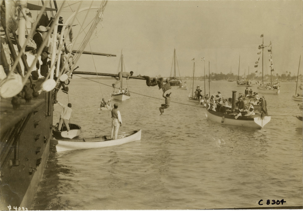 View of several teenage boys climbing on pole of ship over water at Palm Beach boat carnival; spectators watch from boats. Stamped on back: "Photo by N. Lazarnick, 29 West 42nd Street, New York." Handwritten on back: "Boats and boating--Palm Beach water boat carnival, 1905."