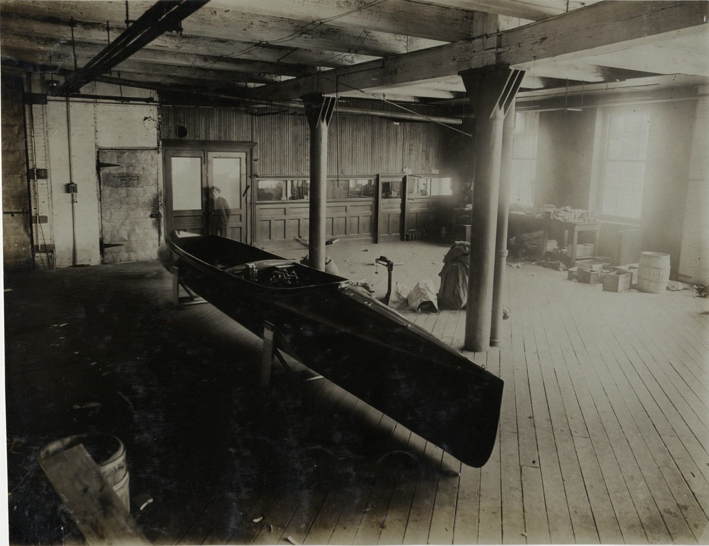 Favorite this☆ Motorboat in workshop Description: View of motorboat under construction in workshop; building materials against wall. Man stands in doorway. Stamped on back: "Photo by F. Ed. Spooner, 1536 B'way, telephone 6536-38th St., New York, N.Y." Handwritten on back: "Boats and boating, 1906." Details Resource ID: na004878 Creator: Spooner, F. Ed. Subject: Motorboats--Design and construction Boatbuilding Photographers--New York (State)--New York Photographic prints Date Issued: 1906 Format: 1 photographic print ; 7.5 x 9.75 in. Member of: National Automotive History Collection Lazarnick Collection Filing Location: Boats and boating, 1906 Rights: Physical rights are retained by DPL. Copyright is retained in accordance with U.S. copyright laws.