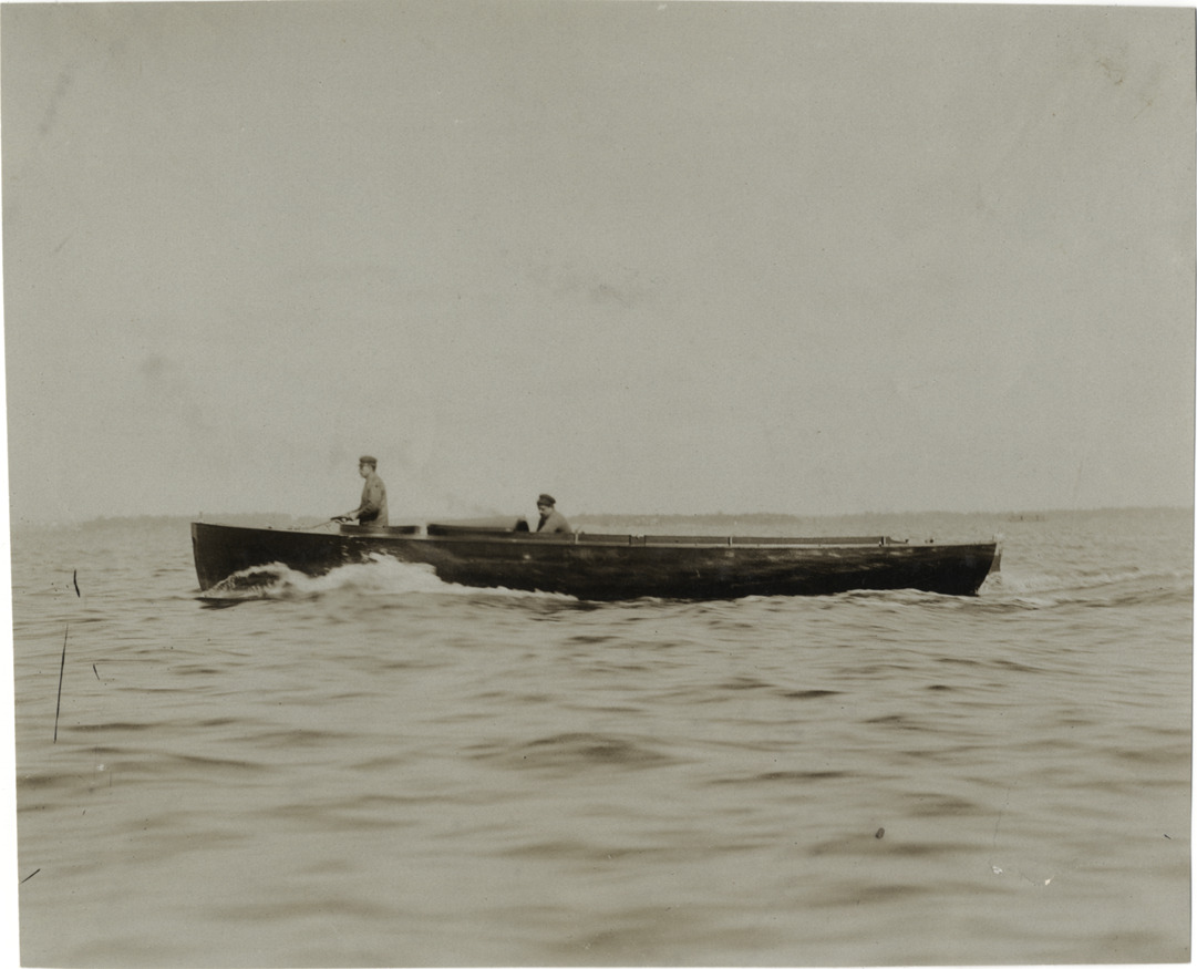 View of two men on motorboat. Stamped on back: "Photo by F. Ed. Spooner, 1536 B'way, telephone 6536-38th St., New York, N.Y." Handwritten on back: "Boats and boating, 1906."