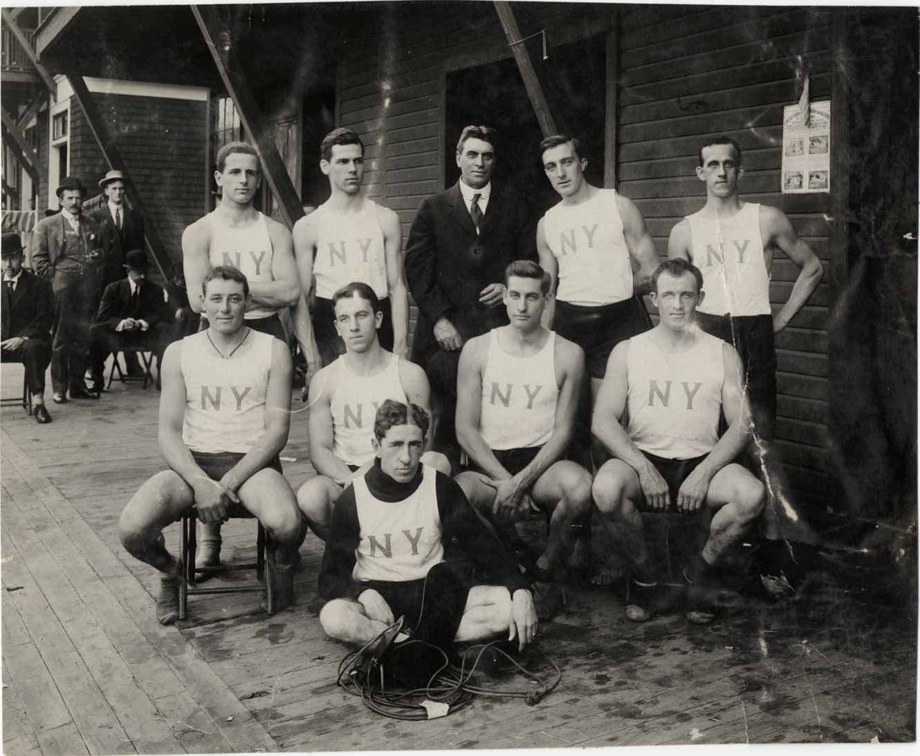Favorite this☆ Rowing club or team Description: Group portrait of rowing club or team; men wear jerseys with "N.Y." on front. Man wearing suit stands in center of group. Handwritten on back: "Boats and boating, 1908." Details Resource ID: na004893 Subject: Rowing clubs Portraits, Group Photographic prints Date Issued: 1908 Format: 1 photographic print ; 7.25 x 9 in. Member of: National Automotive History Collection Lazarnick Collection Filing Location: Boats and boating, 1908 Rights: Physical rights are retained by DPL. Copyright is retained in accordance with U.S. copyright laws.