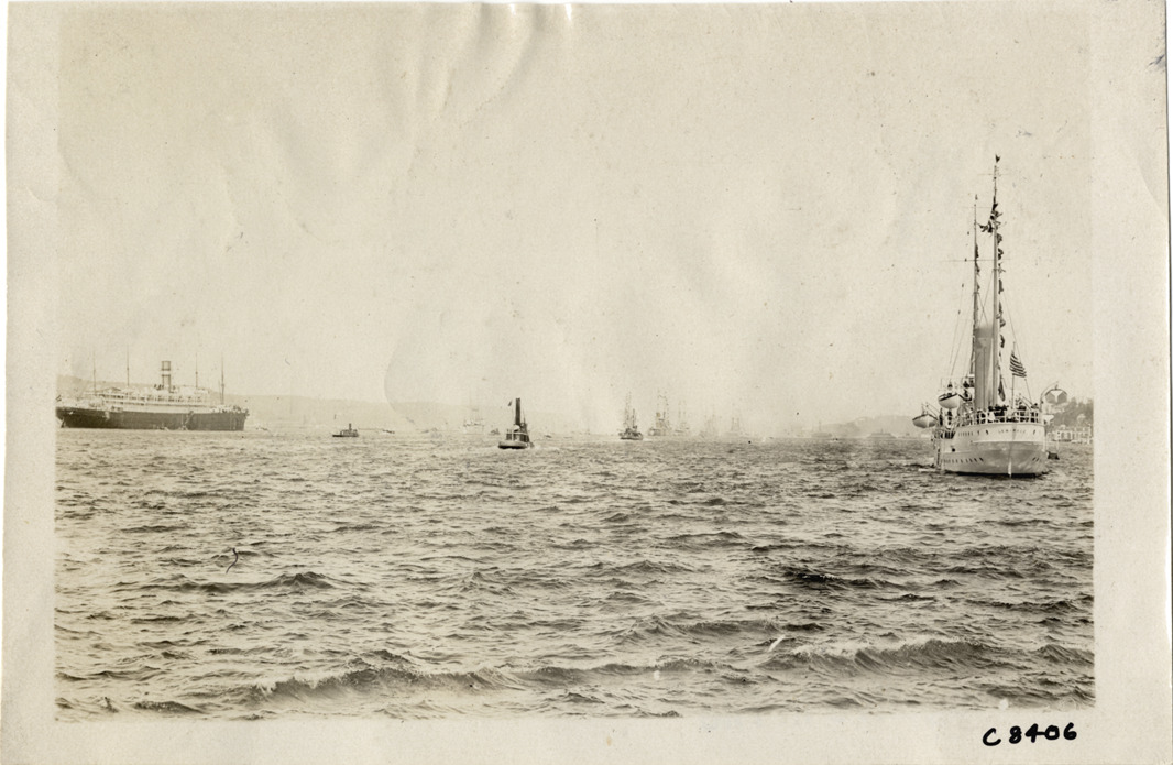 Distant view of steamship and sailing ship during naval parade at Hudson-Fulton Celebration. Stamped on back: "Spooner & Wells, Inc., photographers, telephones 3472-3473 Columbus, 1931 Broadway, New York." Handwritten on back: "Boats and boating--Hudson-Fulton Celebration, naval parade, 1909."