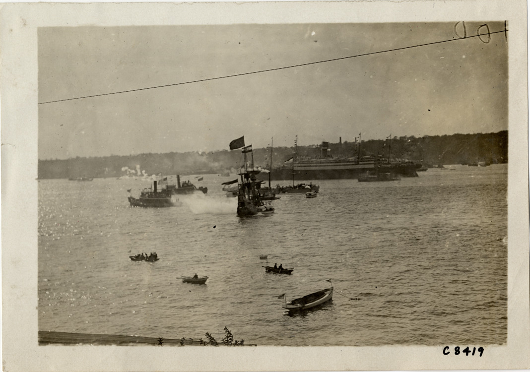 View of sailing ship "Half Moon," steamships, rowboats and other boats on river during naval parade at Hudson-Fulton Celebration. Stamped on back: "Spooner & Wells, Inc., photographers, telephones 3472-3473 Columbus, 1931 Broadway, New York." Handwritten on back: "Boats and boating--Hudson-Fulton Celebration, naval parade, 1909."