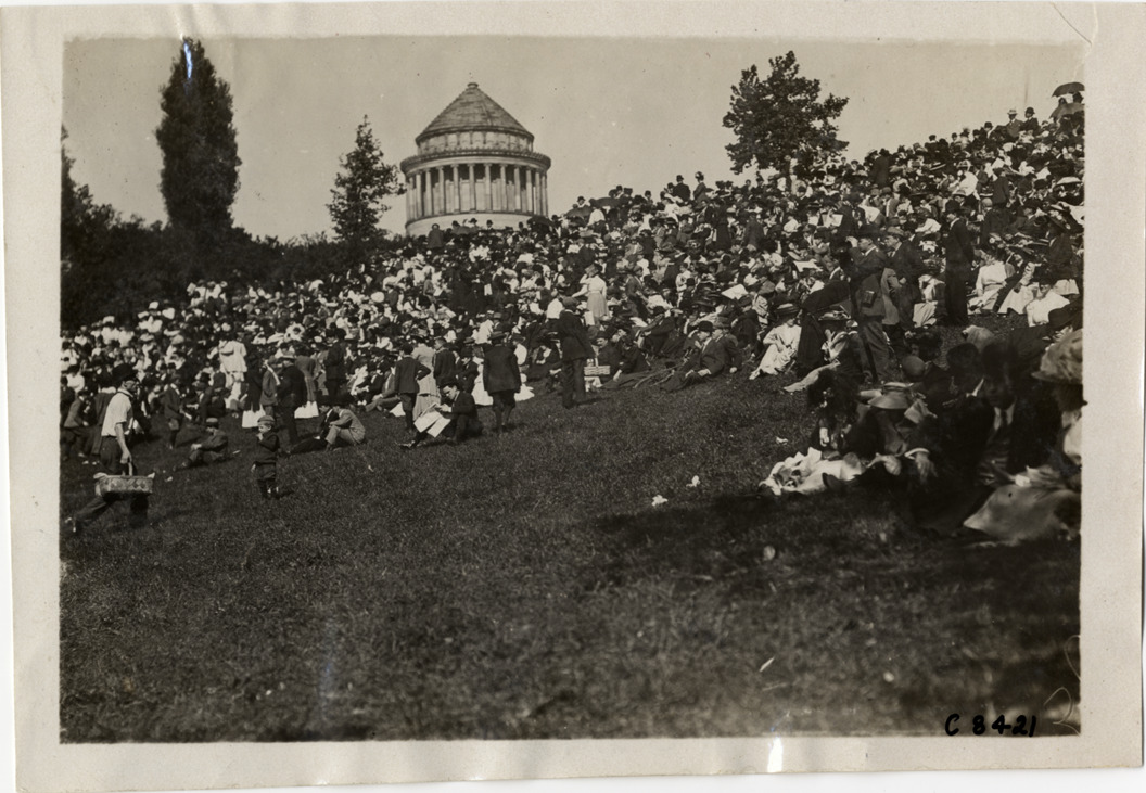 View of crowd on embankment during naval parade at Hudson-Fulton Celebration. Grant's Tomb in background; railroad tracks at edge of water. Stamped on back: "Spooner & Wells, Inc., photographers, telephones 3472-3473 Columbus, 1931 Broadway, New York." Handwritten on back: "Boats and boating--Hudson-Fulton Celebration, naval parade, 1909."