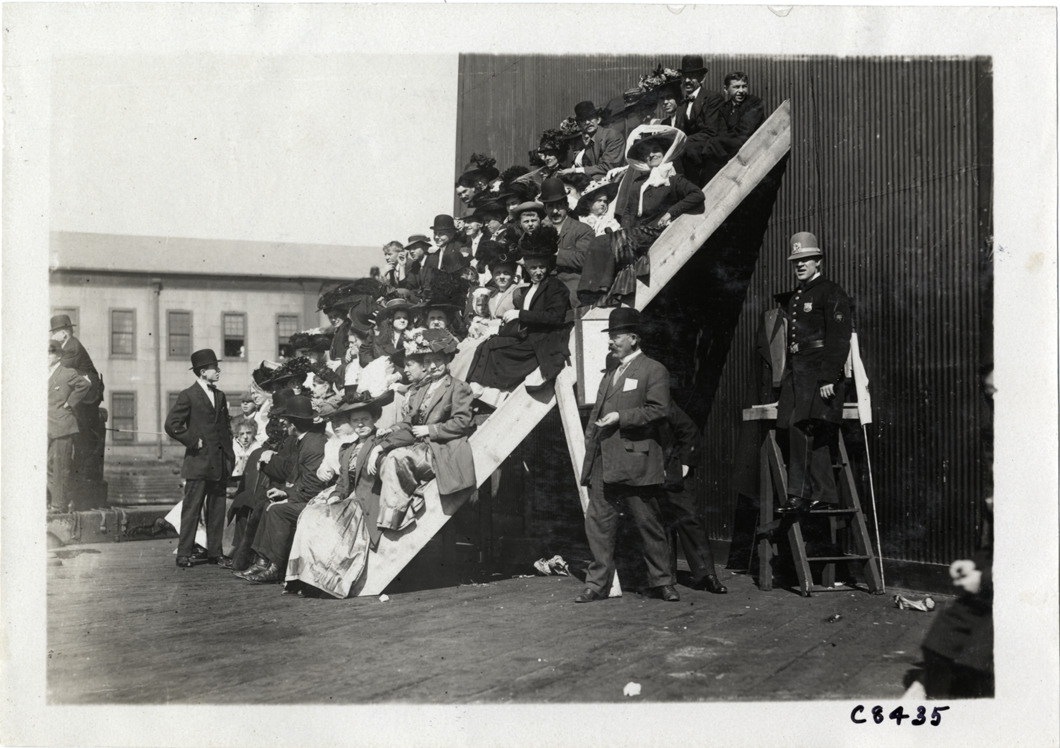 View of men, women and children sitting on wooden bleachers during naval parade at Hudson-Fulton Celebration; policeman stands on small ladder. Stamped on back: "Spooner & Wells, Inc., photographers, telephones 3472-3473 Columbus, 1931 Broadway, New York." Handwritten on back: "Boats and boating--Hudson-Fulton Celebration, naval parade, 1909."