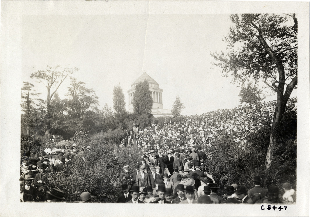 View of crowd on embankment during naval parade at Hudson-Fulton Celebration; Grant's Tomb in background. Stamped on back: "Spooner & Wells, Inc., photographers, telephones 3472-3473 Columbus, 1931 Broadway, New York." Handwritten on back: "Boats and boating--Hudson-Fulton Celebration, naval parade, 1909."