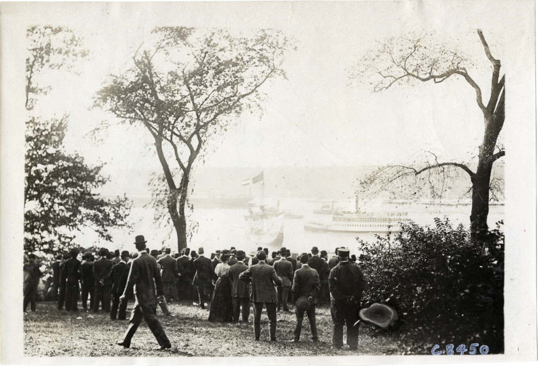 View of crowd on shore watching boats on river during naval parade at Hudson-Fulton Celebration. Stamped on back: "Spooner & Wells, Inc., photographers, telephones 3472-3473 Columbus, 1931 Broadway, New York." Handwritten on back: "Boats and boating--Hudson-Fulton Celebration, naval parade, 1909."