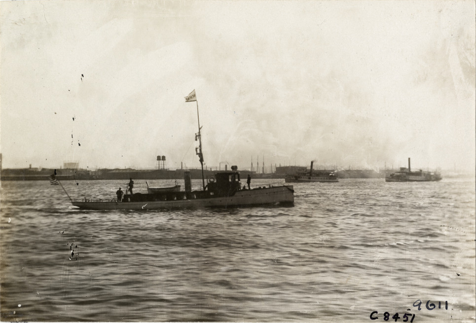 View of motorboat with pilot house and other boats on river during naval parade at Hudson-Fulton Celebration. Stamped on back: "Photo by N. Lazarnick. 244-6-8 W. 42nd Street, N.Y. Tel. 594 Bryant. In ordering duplicates mention number on back of this print." Handwritten on back: "Boats and boating--Hudson-Fulton Celebration, naval parade, 1909."