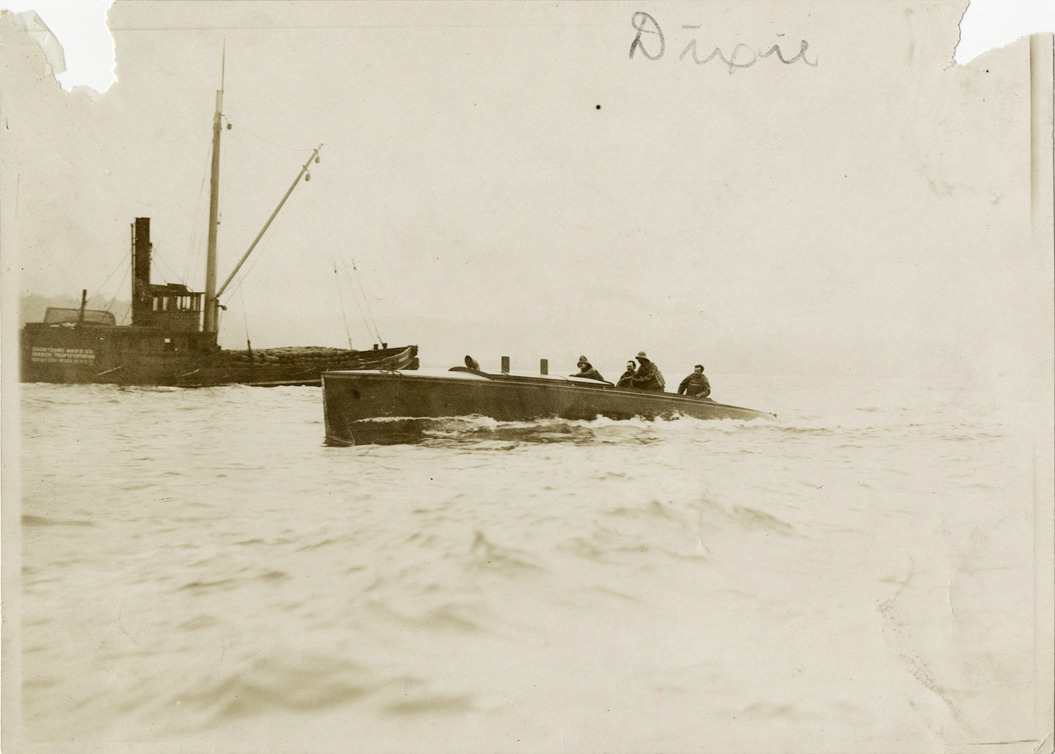 Men on motorboat "Dixie"