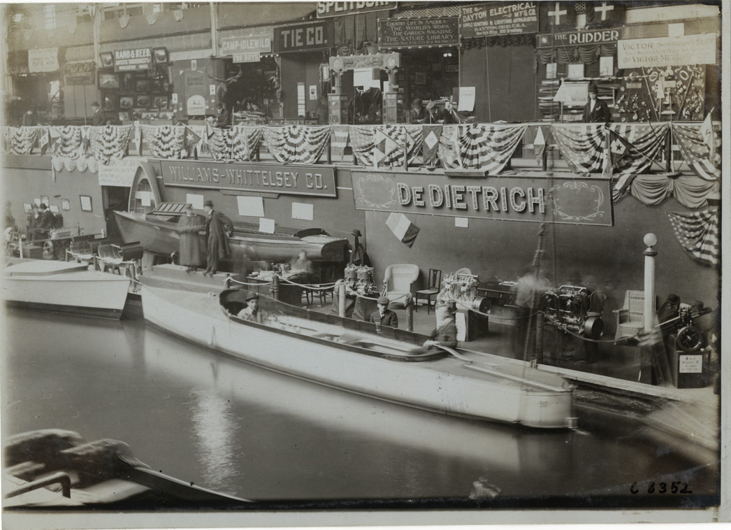 View of vendor displays at 1905 Boston Boat Show; men sit in boats moored to side of indoor waterway. Signs for De Dietrich and Williams-Whittelsey Co. on lower level; railings decorated with bunting. Handwritten on back: "Boats and boating--Boston Boat Show, 1905."