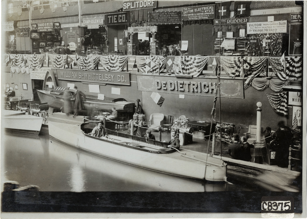 View of men sitting in motorboat docked in front of De Dietrich display at 1905 Boston Boat Show. Signs for De Dietrich, Dayton Electrical Mfg. Co., the Rudder, Splitdorf, Tie Co. and Williams-Whittelsey Co. on walls; bunting decorates railing. Handwritten on back: "Boats and boating--Boston Boat Show, 1905."
