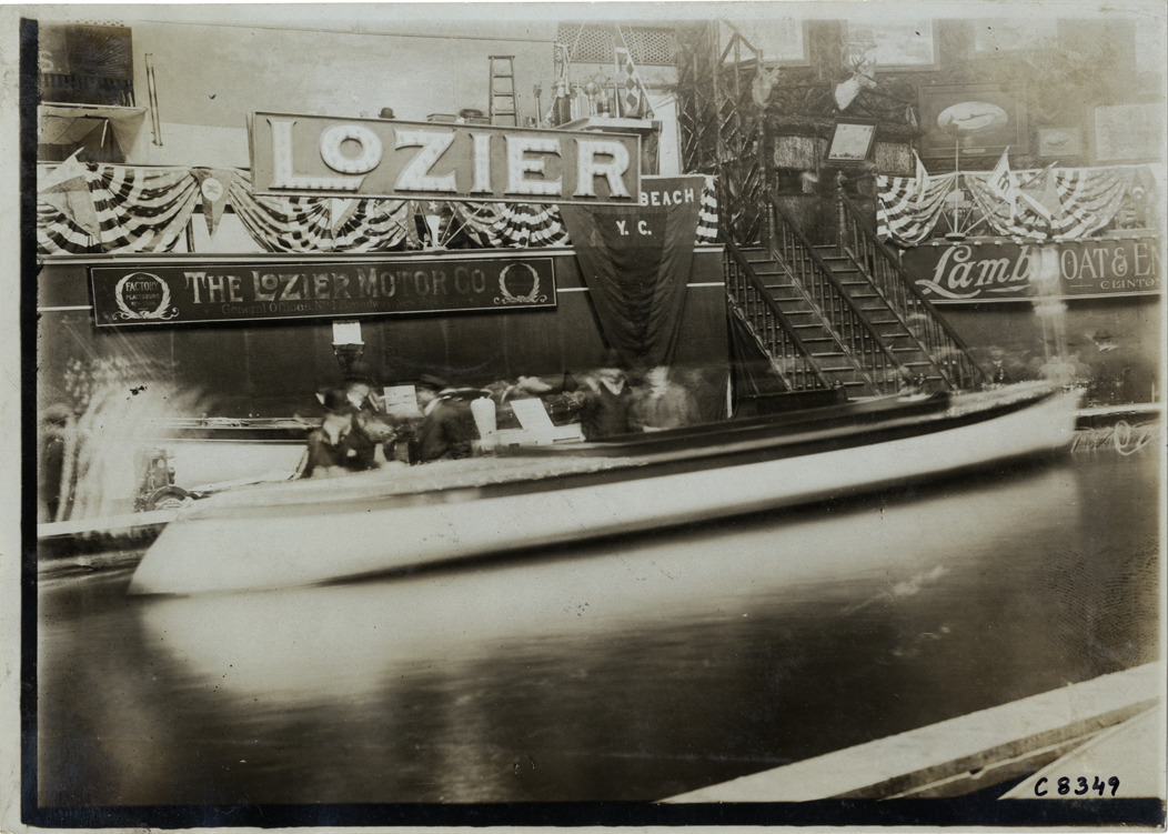 View of motorboat on indoor waterway in front of Lozier Motor Company display at 1905 Boston Boat Show. "Lozier" electric sign on wall; bunting decorates railing; stairs to upper level on right. Handwritten on back: "Boats and boating--Boston Boat Show, 1905."