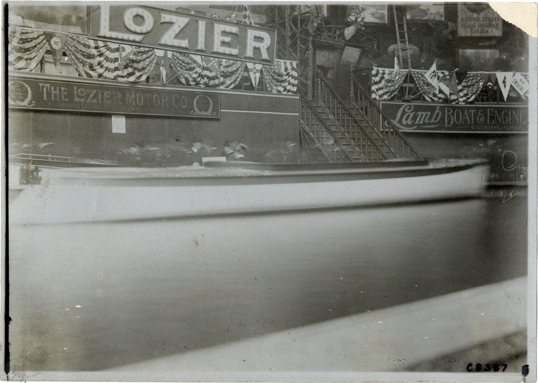 Motorboat in front of Lozier Motor Company display at 1905 Boston Boat Show