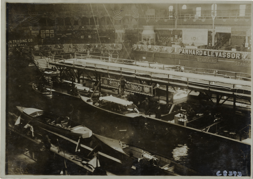 View of dock and boats on indoor waterway at 1905 Boston Boat Show. Smith & Mabley Manufacturing Company sign on dock; Panhard & Levasssor sign in background. Bunting decorates railings; flags are suspended from ceiling. Handwritten on back: "Boats and boating--Boston Boat Show, 1905."