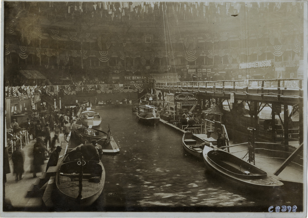 Boats on indoor waterway at 1905 Boston Boat Show