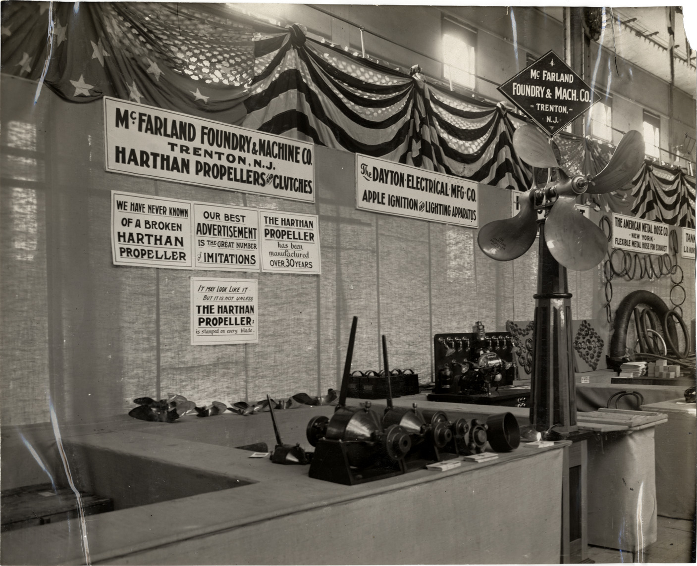 View of Harthan propellers at McFarland Foundry & Machine Company display during 1909 New York Boat Show. Sign overhead: "McFarland Foundry & Machine Co., Trenton, N.J., Harthan propellers and clutches. We have never known of a broken Harthan propeller, our best advertisement is the great number of imitations, the Harthan propeller has been manufactured over 30 years, it may not look like it, but it is not unless the Harthan propeller is stamped on every blade." Handwritten on back: "Boats and boating--NY Boat Show, 1909."