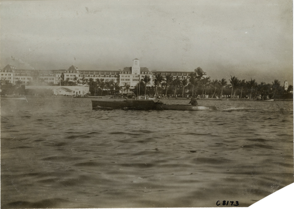 Favorite this☆ Motorboat "Six Shooter" at Palm Beach boat races Description: View of motorboat "Six Shooter" at Palm Beach boat races; Hotel Royal Poinciana on shore in background. Handwritten on back: "Boat races--Palm Beach races, 1906." Details Resource ID: na005091 Subject: Motorboats--Florida--Palm Beach Motorboat racing--Florida--Palm Beach Hotels--Florida--Palm Beach Photographic prints Date Issued: 1906 Format: 1 photographic print ; 4.5 x 6.5 in. Member of: National Automotive History Collection Lazarnick Collection Filing Location: Boat races--Palm Beach races, 1906 #1 Negative Number: Negative #C8173 Rights: Physical rights are retained by DPL. Copyright is retained in accordance with U.S. copyright laws.