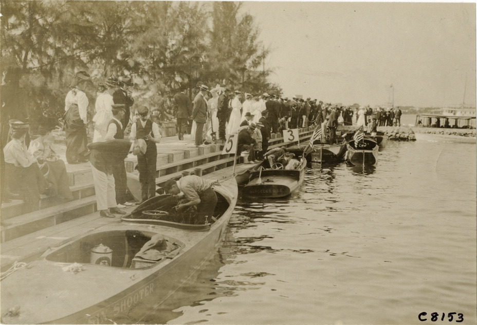 View of motorboats "Six Shooter," "Mercedes" and "Topsy" moored to dock at Palm Beach boat races. Spectators stand on dock. Handwritten on back: "Boat races--Palm Beach races, 1906."