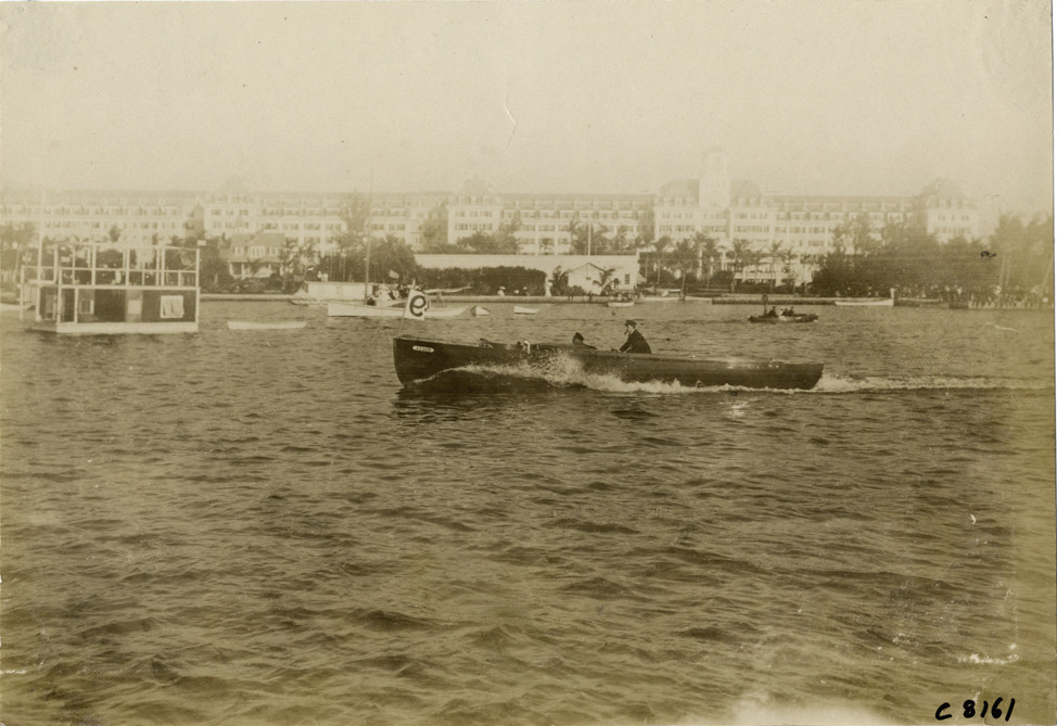Favorite this☆ Motorboat "Allon" at Palm Beach boat races Description: View of motorboat "Allon" at Palm Beach boat races; Hotel Royal Poinciana on shore in background. Handwritten on back: "Boat races--Palm Beach races, 1906." Details Resource ID: na005108 Subject: Motorboats--Florida--Palm Beach Motorboat racing--Florida--Palm Beach Hotels--Florida--Palm Beach Photographic prints Date Issued: 1906 Format: 1 photographic print ; 4.5 x 6.5 in. Member of: National Automotive History Collection Lazarnick Collection Filing Location: Boat races--Palm Beach races, 1906 #1 Negative Number: Negative #C8161 Rights: Physical rights are retained by DPL. Copyright is retained in accordance with U.S. copyright laws.